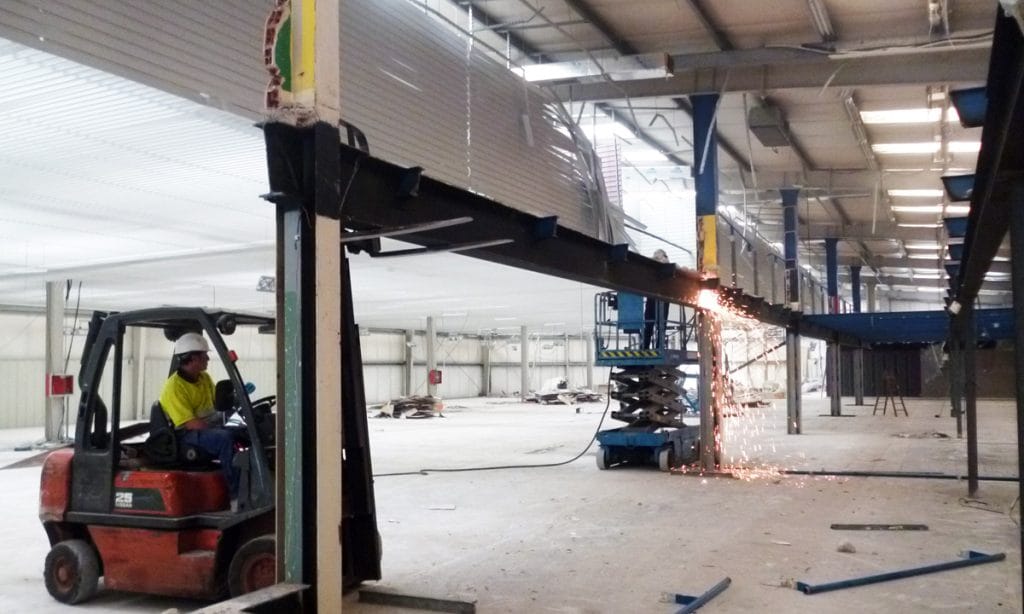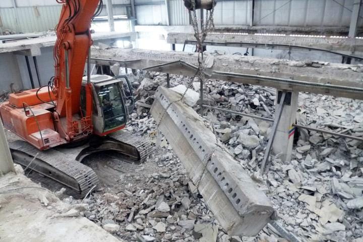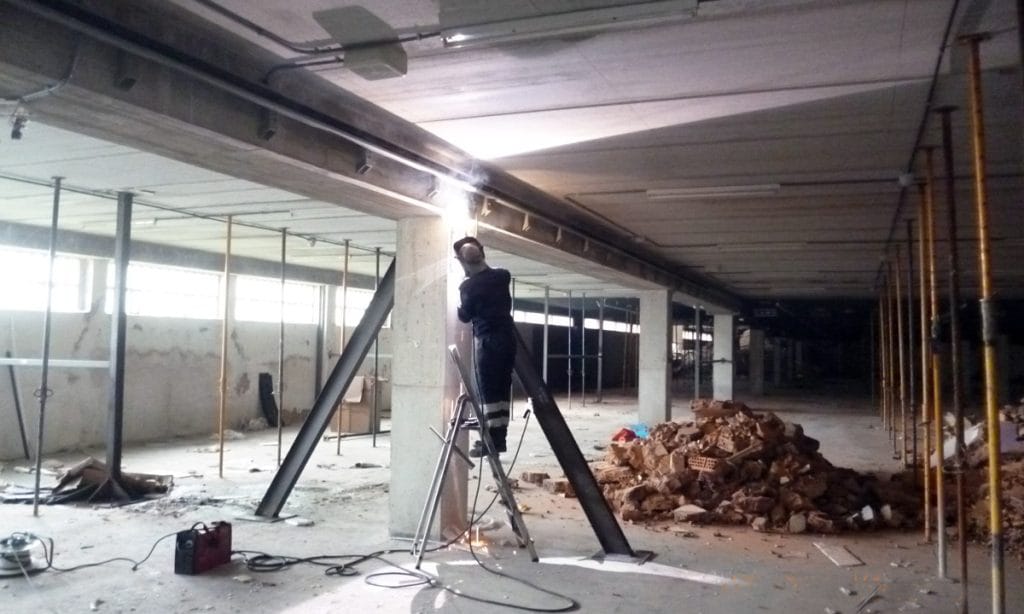 Para elevar el techo del sótano de la nave, ha sido necesaria la demolición del forjado de hormigón de la nave, mediante retroexcavadora con demoledor, mientras que las vigas de hormigón del forjado, se han cortado con hilo de diamante, para evitar daños en la estructura de la nave.