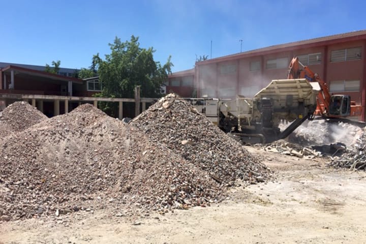 Finalmente, el escombro de los bloques de aulas han sido valorizados “in situ” mediante planta de machaqueo móvil, de acuerdo a la autorización como gestor de la empresa HIERROS Y METALES TIRSO SA. Este material valorizado ha sido empleado en obra para el relleno de la parcela y acondicionamiento de la misma.