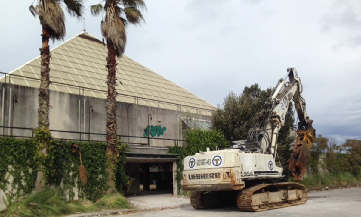 Por encargo de la empresa COMMERCIAL MARINE NORTH COAST, S.L, se realiza la demolición de la antigua discoteca AQUA. En el polígono industrial de Raos. Se trataba de una construcción realizada sobre estructura de hormigón, con muros interiores y pilares de hormigón armado, así como losa de cimentación. La parte más característica de la construcción era una pirámide de estructura metálica, de unos 25 m de altura y paneles de policarbonato.