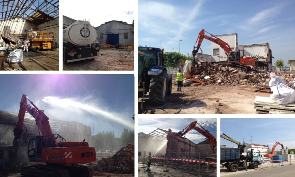 Antes del inicio de la demolición de las naves, se ha realizado una recogida selectiva de los residuos de la obra (madera, vidrio, papel y cartón, basura, pladur, aceites,…). La demolición se ha ejecutado con retroexcavadora equipada con demoledor, y en prevención de la formación de polvo se ha estado regando el tajo continuamente. Se ha retirado previamente la cubierta de fibrocemento, en una superficie aproximada de 3450 m2.