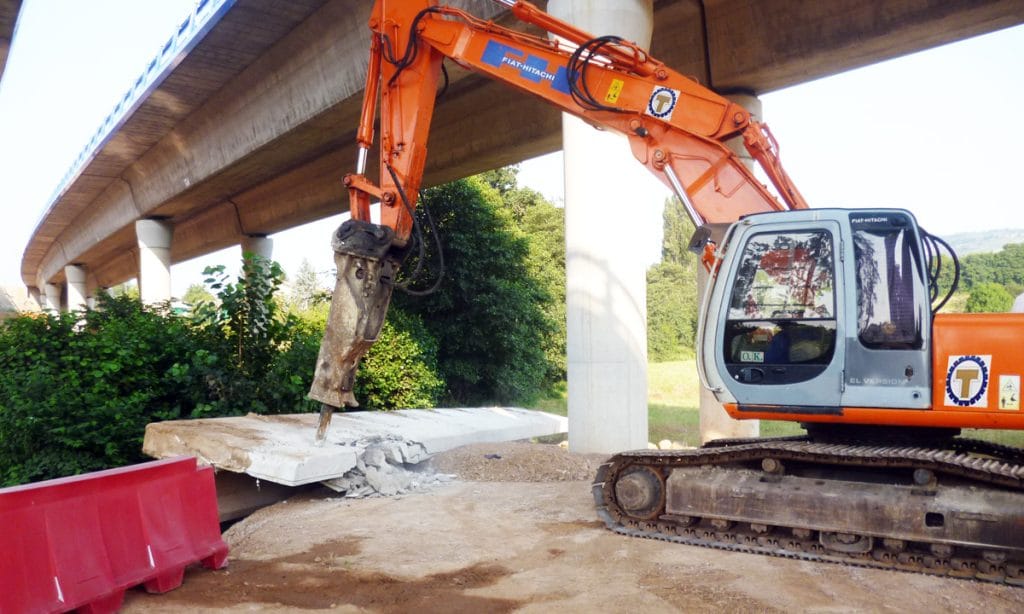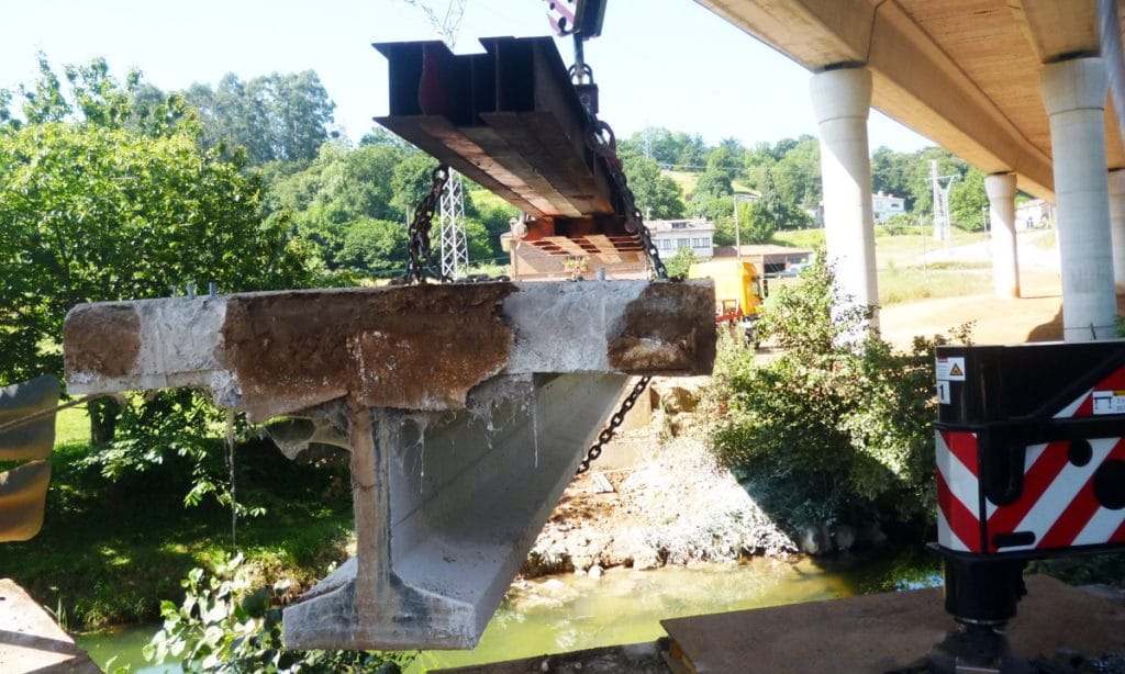 A continuación, mediante una grúa autopropulsada, las piezas cortadas se izaron y depositaron en el margen del río, donde finalmente una retroexcavadora con martillo realizó el picado de las vigas y losa, para su transporte a vertedero autorizado.