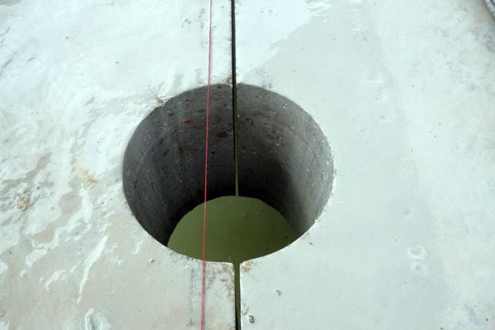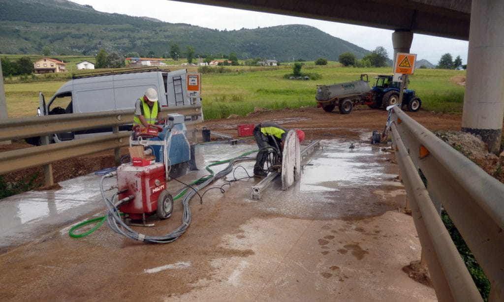 Para su retirada, en primer lugar se realizó el apuntalamiento de la estructura, paso previo al corte longitudinal con disco entre vigas de la estructura. Se realizaron también agujeros con taladro con broca de diamante, para el estrobado de las piezas cortadas.