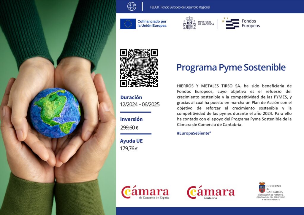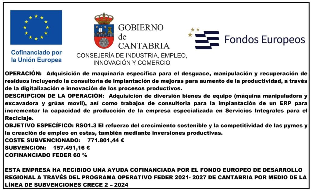 Hierros y Metales Tirso S.A ha recibido una ayuda cofinanciada por el Fondo Europeo de Desarrollo Regional a través del Programa Operativo FEDER 2021-2027 de Cantabria, por medio de la línea de subvenciones CRECE 2 – 2024.