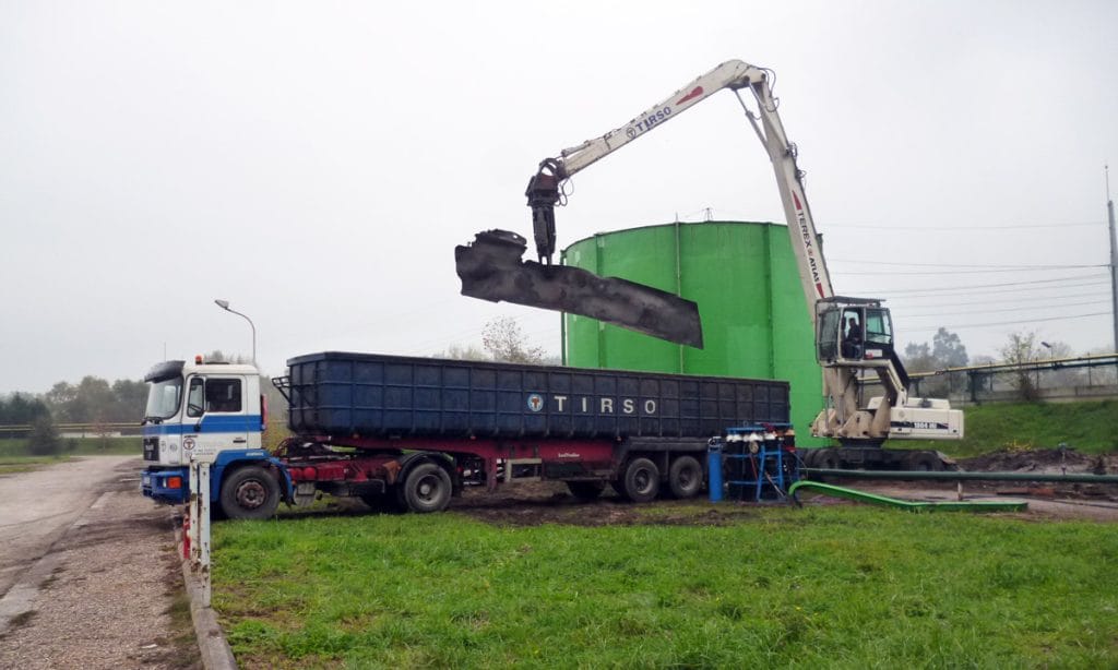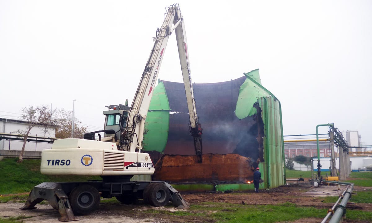 The work has been done with hydraulic shears coupled to backhoe. The difficulty of the work lay in the existence of hydrogen pipes very close to the tank, forcing a demolition directed inwardly thereof, necessarily maintaining the next pipe in service. The scrapped tank portions were cut by torch and loaded on trucks for transport and subsequent recovery.